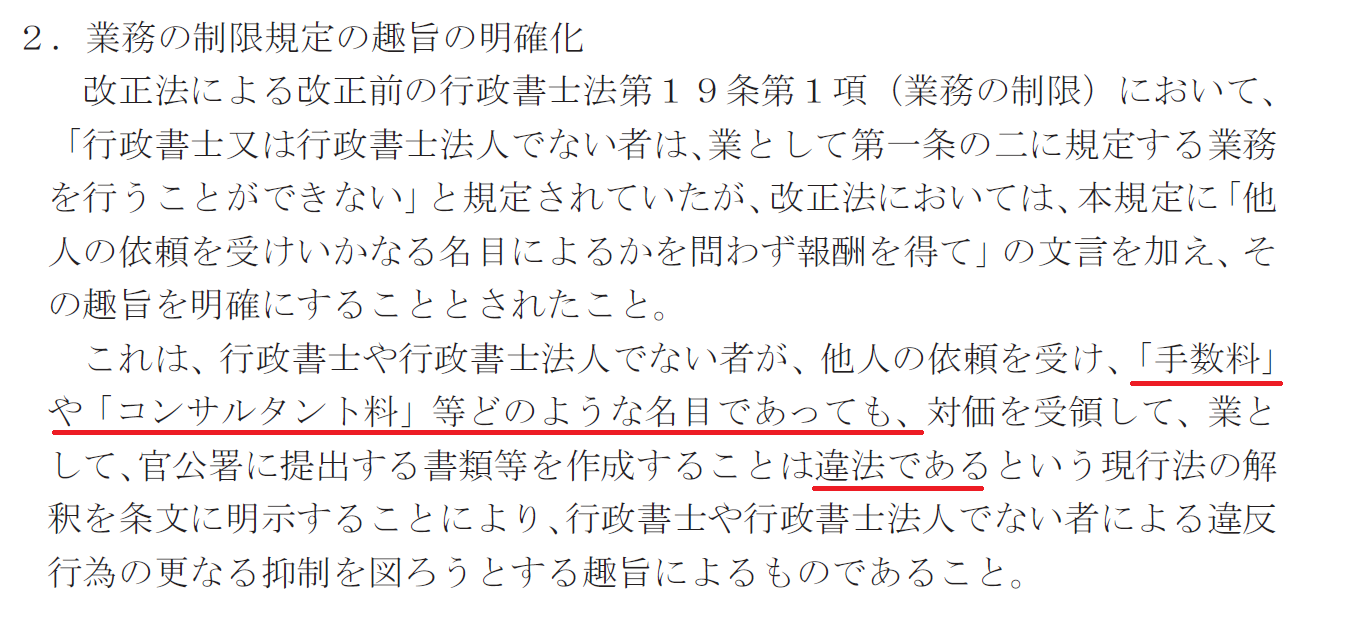 行政書士でない者が、報酬を得て官公署への提出書類を作成することを禁じる規定について、「他人の依頼を受けいかなる名目によるかを問わず報酬を得て」という文言が加えられ、趣旨がより明確になりました。
